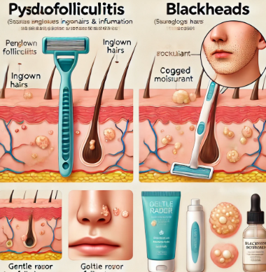 소극성 속모증과 블랙헤드는 모두 모공과 관련된 피부 문제이지만, 그 원인과 발생 메커니즘에서는 차이가 있습니다. 소극성 속모증은 주로 모발이 피부 속에서 자라면서 염증을 일으키는 반면, 블랙헤드는 피지와 죽은 피부 세포가 모공을 막으면서 발생합니다. 또한, 소극성 속모증은 면도 후에 발생하는 경향이 있으며, 염증과 통증을 동반하는 반면, 블랙헤드는 염증 없이 검은 점으로 나타나며 통증이 없는 경우가 대부분입니다.