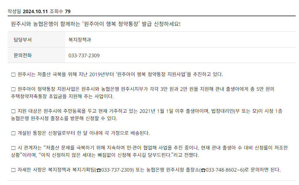 - 온라인 신청: 원주시청 홈페이지에서 원주아이 행복청약통장 신청서를 다운로드하고, 작성 후 제출할 수 있습니다.